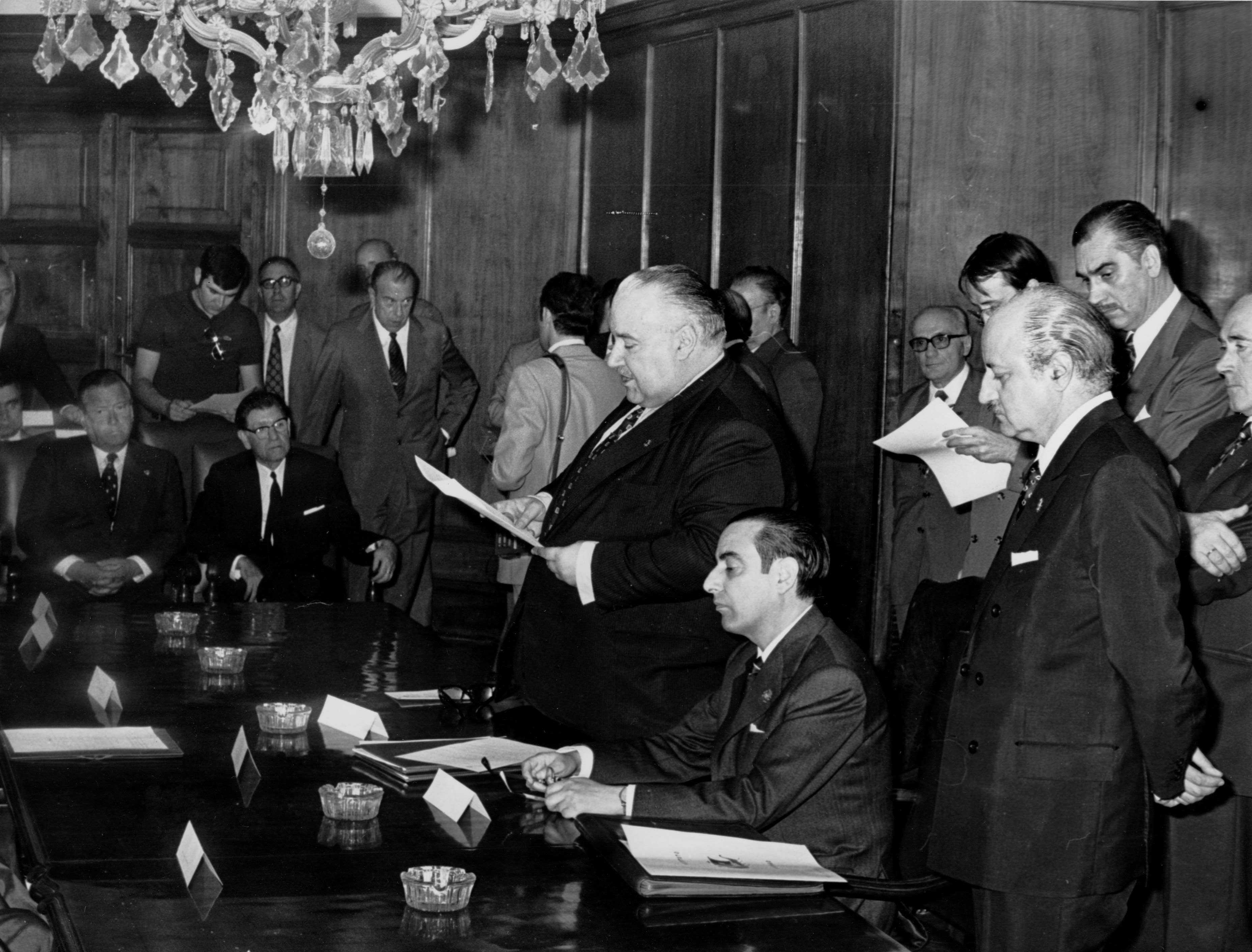 Firma del Convenio entre el Instituto Nacional de Previsión y la Diputación Provincial de Santander para la creación del Centro Médico Nacional “Marqués de Valdecilla”.